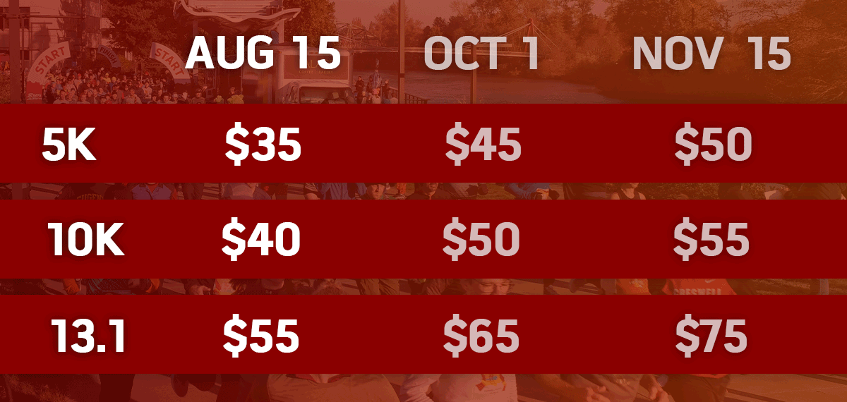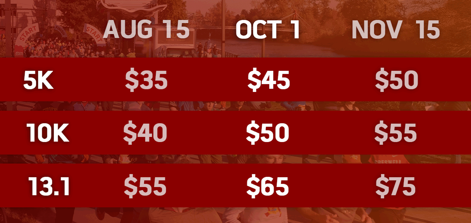 Free Kids Race: Bring the kiddos for a FREE 400ish meter dash. The dash begins at 8:30 am and starts near the same start line as the other distances. The course is a straight "out and back" along the river path.